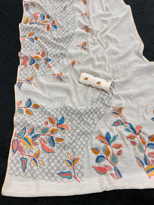 "White Leaf Elegance: Pure Cotton Saree for Graceful Charm"