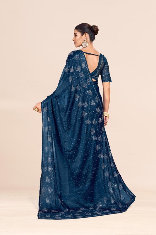 Copper Swaroski Satin Navy Blue Saree with Copper Swaroski Stone Work.